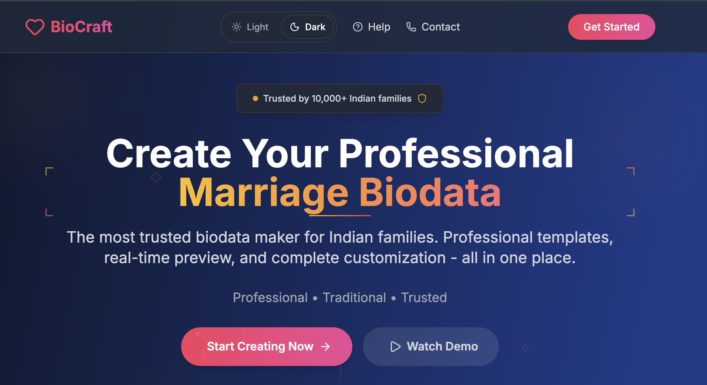 BiodataCraft is a premium, privacy-focused matrimonial biodata maker that requires no login. It empowers users to create professional marriage profiles in minutes using 22+ premium templates. The platform offers a frictionless experience with features like instant PDF download, deep customization (Gotra, Rashi, Family details), and a secure, client-side data handling approach. Perfect for users looking for a quick, beautiful, and hassle-free way to create their marriage biodata.